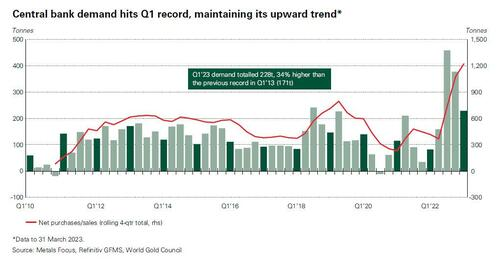 It may not be the off the charts gold buying observed in the second half of 2022, but central bank Central bank gold buying made a blistering start to 2023 when according to the latest report from the World Gold Council, demand for the hard currency by the world’s money-printing authorities reached 228 tonnes in Q1, a 176% increase compared to the 82.7 tonnes one year ago. While lower than the figures seen in the previous two quarters this was nonetheless the strongest first quarter on record. According to the WGC, “this is all the more impressive considering it follows the record-breaking pace of demand last year.”