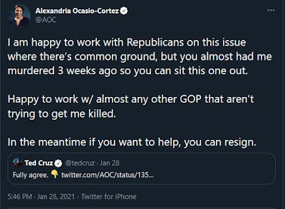She is outright accusing Cruz of trying to have her killed: “You almost had me murdered” . Give us all a break sweetie, if the intent was to kill you all, your rotting head would be stuck on a spike outside of the Capitol with only your giant chompers recognizable. So instead of being an adult and working with one of the most prominent Republicans in the legislative branch, she instead throws a middle school tantrum online. The spectacle of a tavern wench with an undergrad degree in economics barking at a man who graduated magna cum laude from Harvard Law because he asked legitimate questions about the bullshit election in 2020 is grotesque.