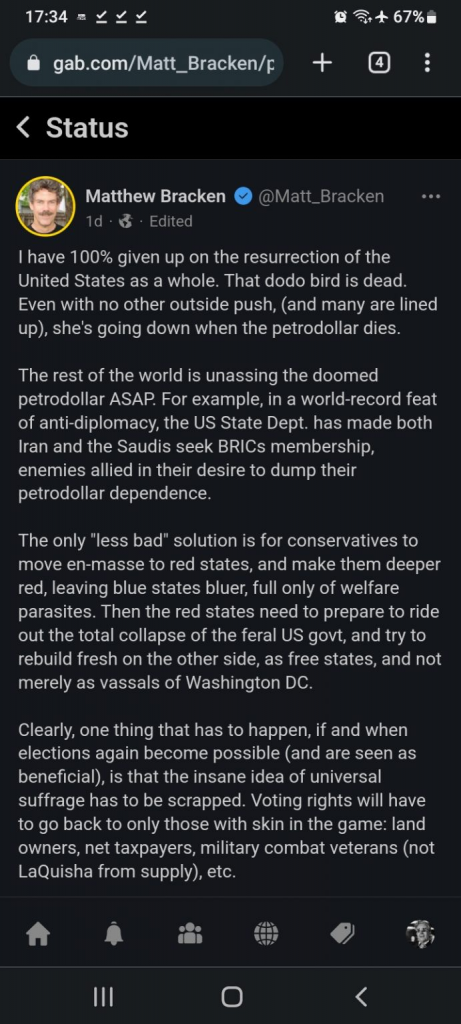 […] foundation. We need to go back the true meaning of our founding documents. They need to be enforced. I agree with Matt Bracken about voting rights. I’m not worried about hurting people’s feelings. The leeches of society shouldn’t have a say […]