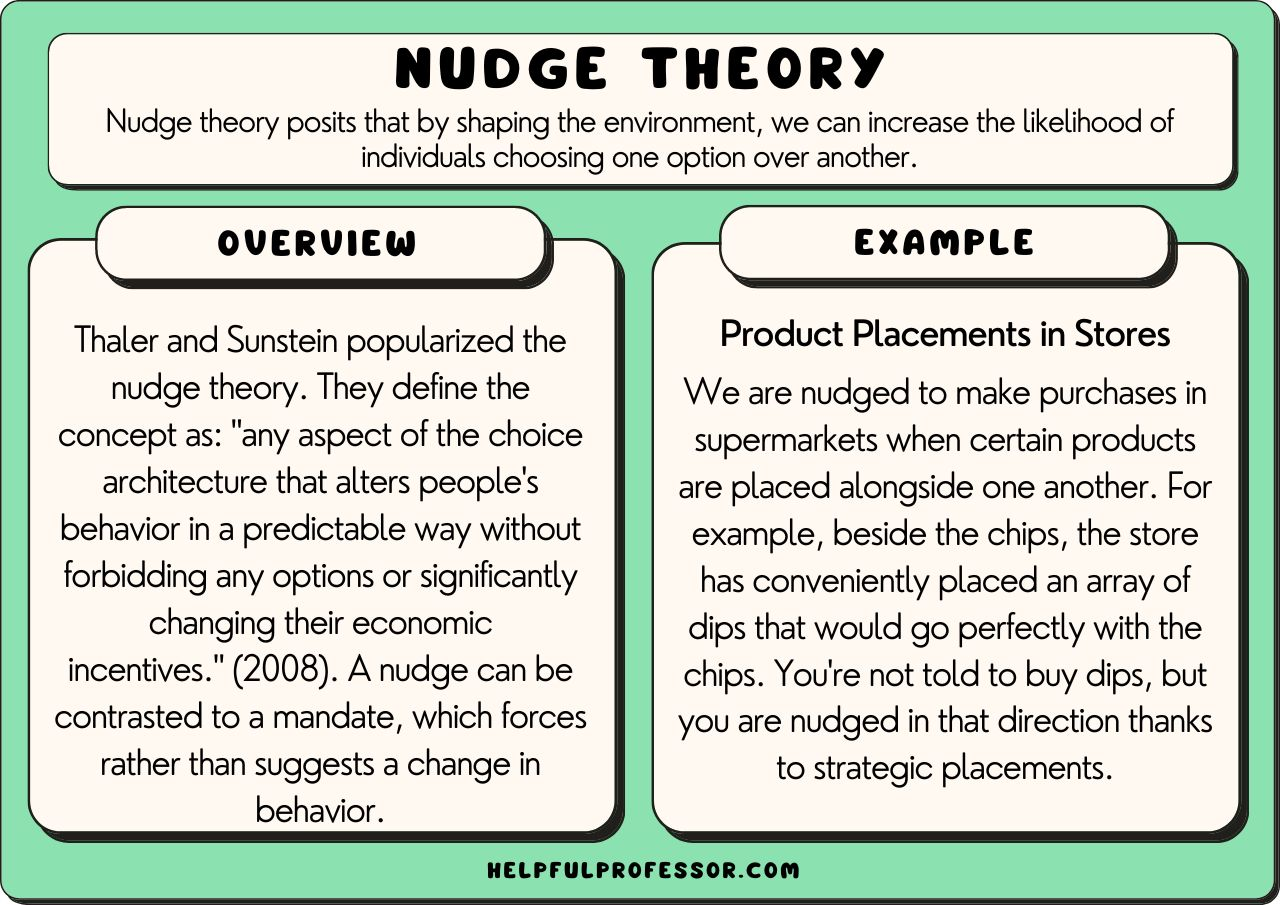 Political Applications: The nudge theory has been quickly adopted by governments around the world to influence citizen behavior. In 2008, the US government got Cass Sunstein himself and appointed him administrator of the Office of Information and Regulatory Affairs. Two years later, the UK also established its “Nudge Unit”, which was led by David Halpern. Both David Cameron and Barack Obama employed the nudge theory to advance domestic policy goals in their countries (McSmith, 2010). More recently, Boris Johnson’s government tried to fight the coronavirus pandemic by using the nudge theory to encourage “herd immunity”. (Costello, 2020).